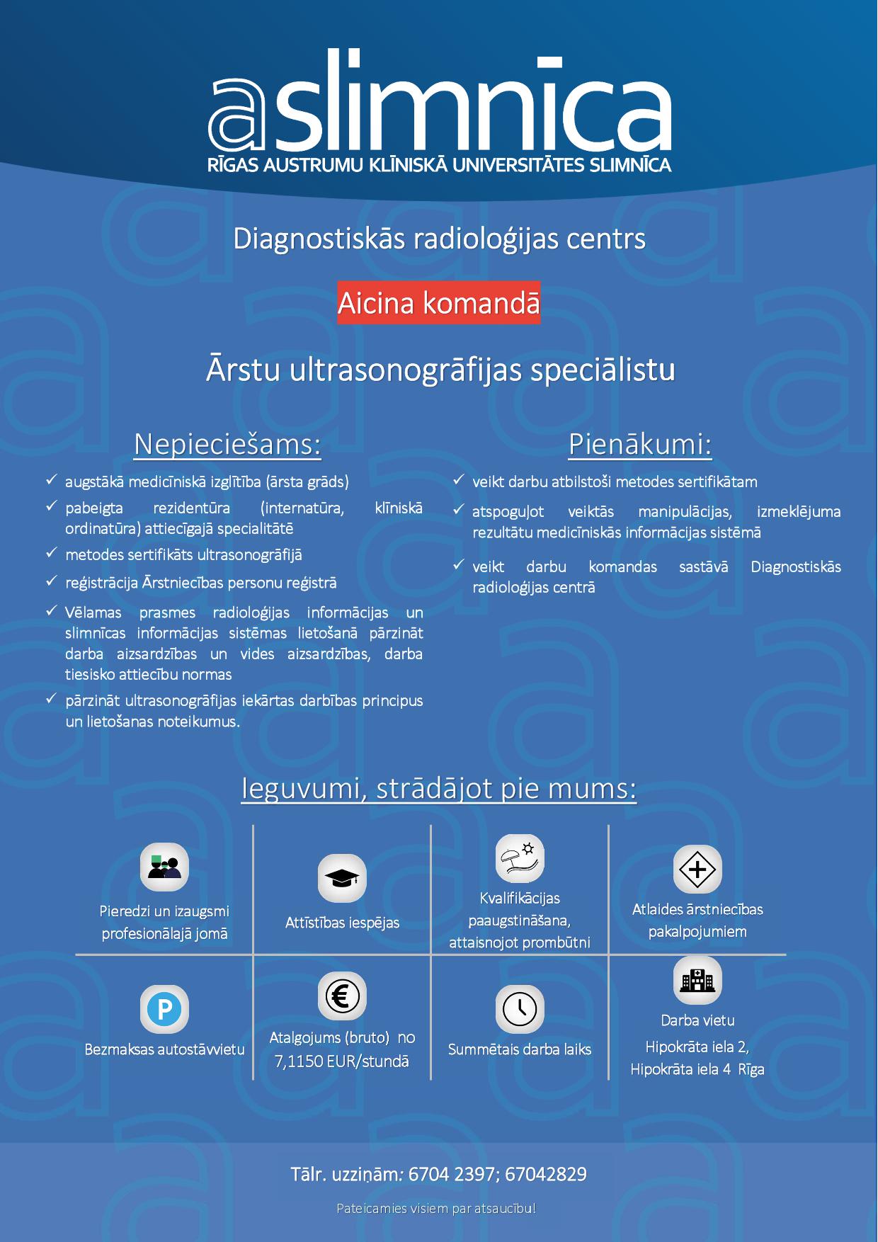 - Vēlamas prasmes radioloģijas informācijas un slimnīcas informācijas sistēmas lietošanā pārzināt darba aizsardzības un vides aizsardzības, darba tiesisko attiecību normas
